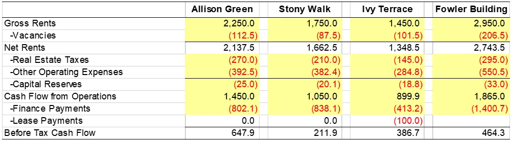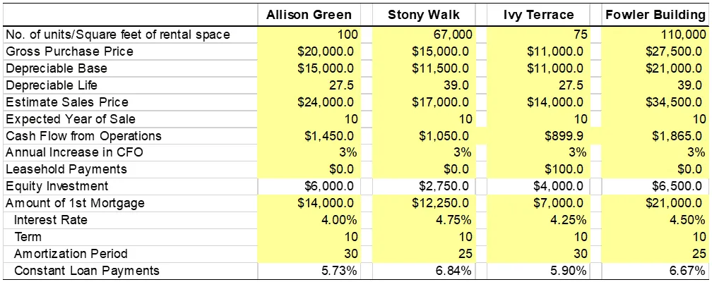 The four prospective properties are Allison Green, Stony Walk, Ivy Terrace, and Fowler Building. Mr. Cartwright is now tasked to compare and contrast the four prospective properties.