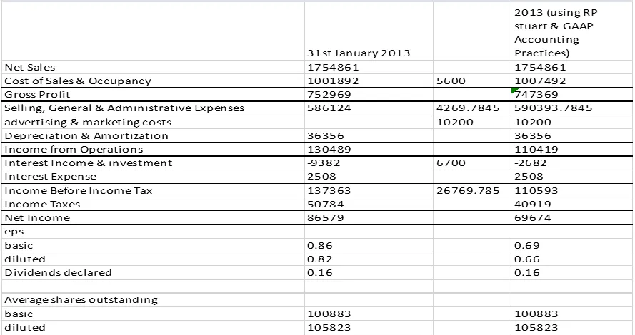 RP Stuart uses FIFO accounting practices. For Nuware 2012, the COGS would have been $35.1m higher, and for 2013, $29.5m higher.The difference in the inventory would be due to the cost of sales using the FIFO method. Hence, $5.6m is the difference that needs to be added when we restate the income statement.