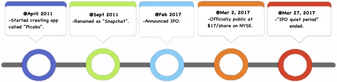 According to the summarized timeline above, Snap, the disappearing-message app, went public at $17 per share on March 2, 2017, making its two 20-something founders the youngest self-made billionaires in the country.